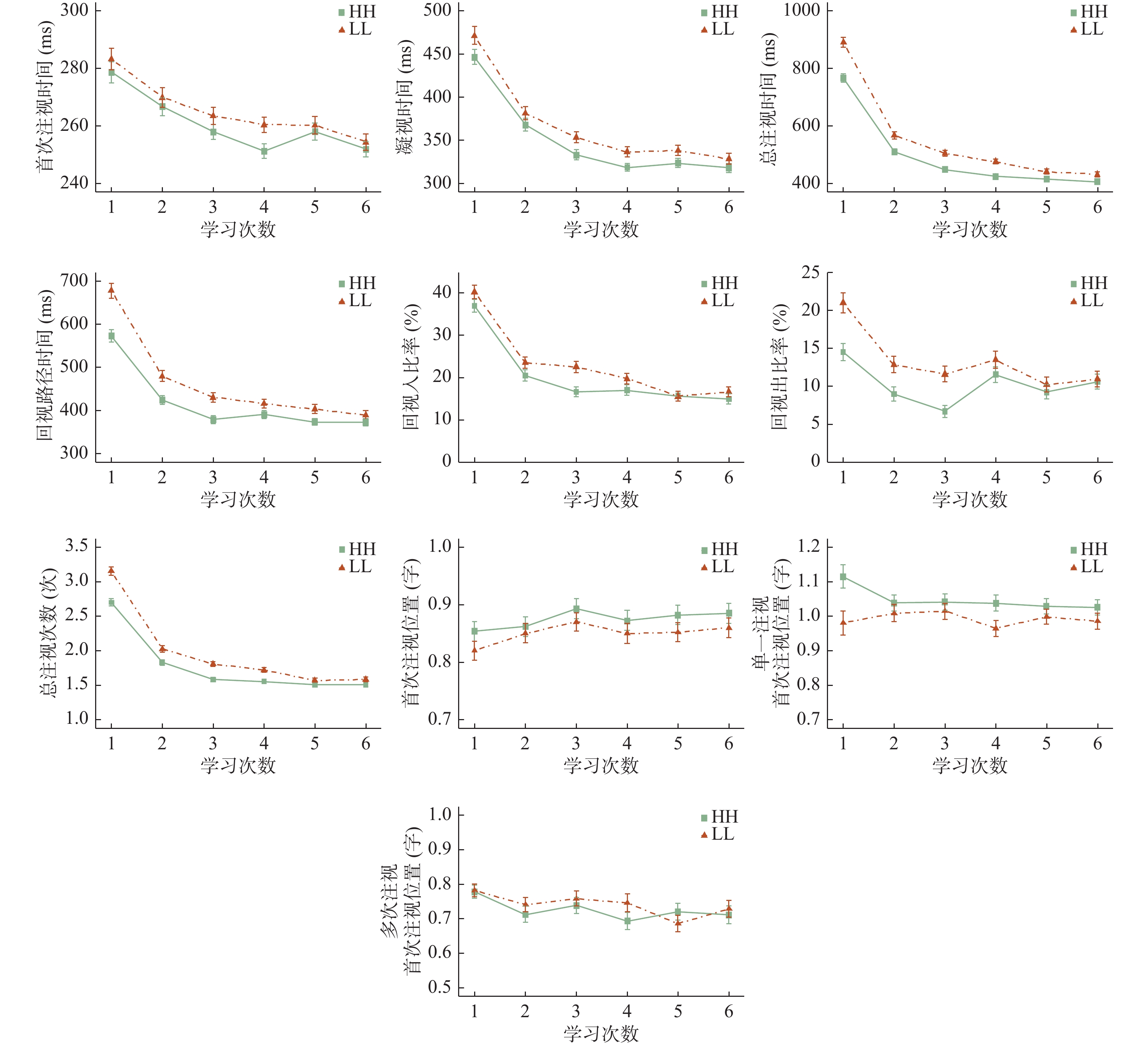 | 总注视时间(ms) | HH | 766±470 | 509±339 | 447±286 | 423±274 | 414±242 | 406±273 |