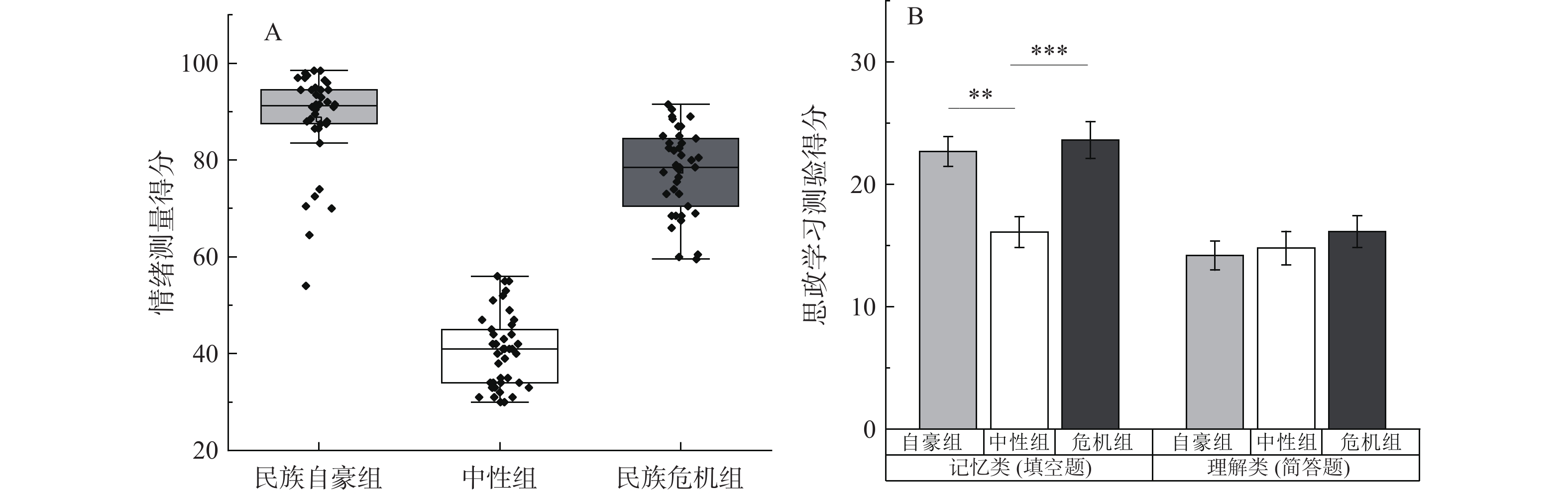 本研究通过行为实验探讨复杂社会情绪(民族危机感与自豪感)对后续记忆编码的选择性增强作用。实验1采用被试间设计,随机分配被试至民族危机感、民族自豪感及中性情绪唤醒组,随后评估记忆编码能力。结果表明,民族情绪唤醒显著增强了思政相关的记忆编码,而对插图记忆无显著影响。实验2沿用实验1设计,但以数理统计材料为记忆内容,发现民族情绪唤醒不影响数理统计记忆编码。本研究不仅增进了复杂社会情绪对记忆的影响作用的理解,还为高校思政教育方法的优化提供了有力的实证支撑。