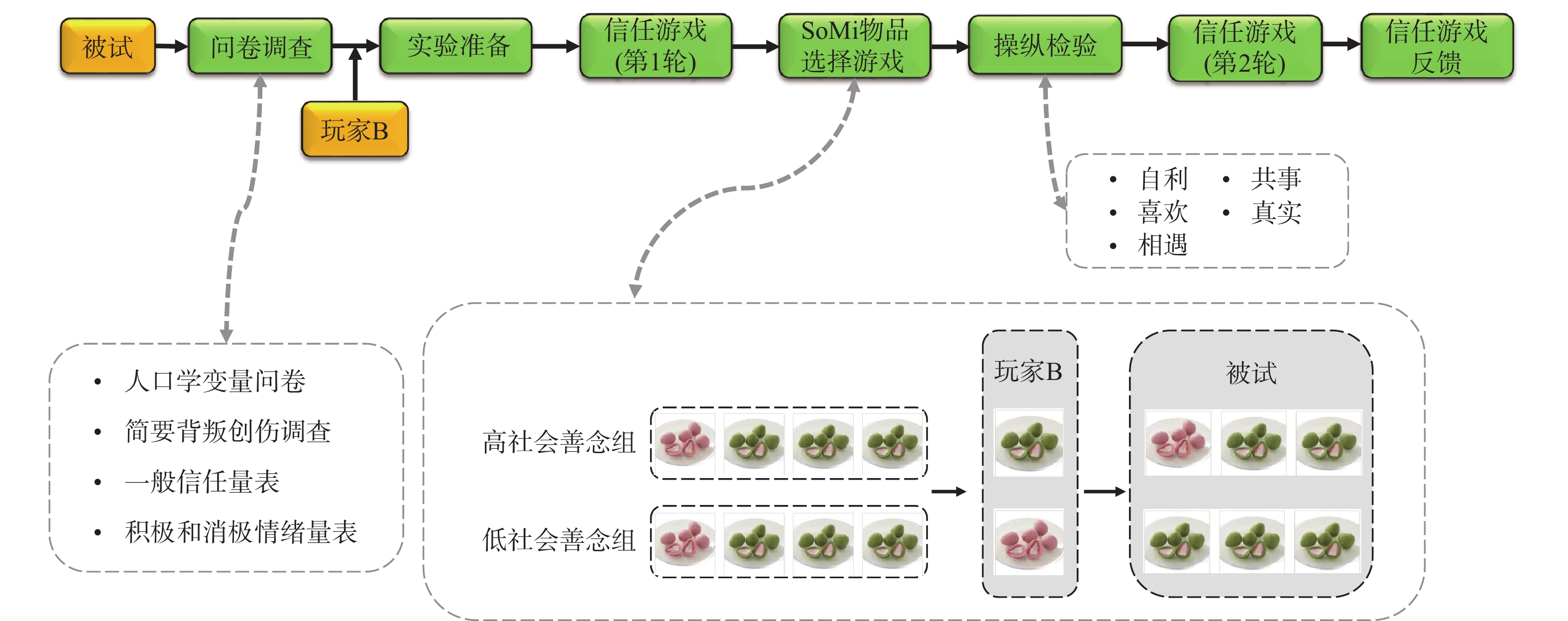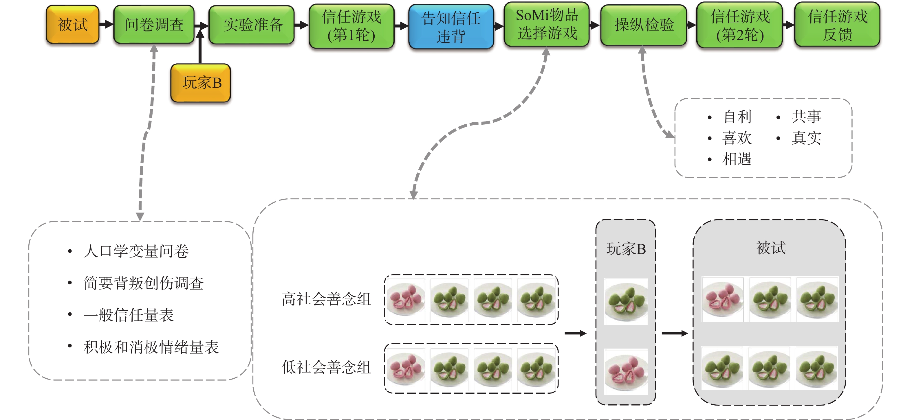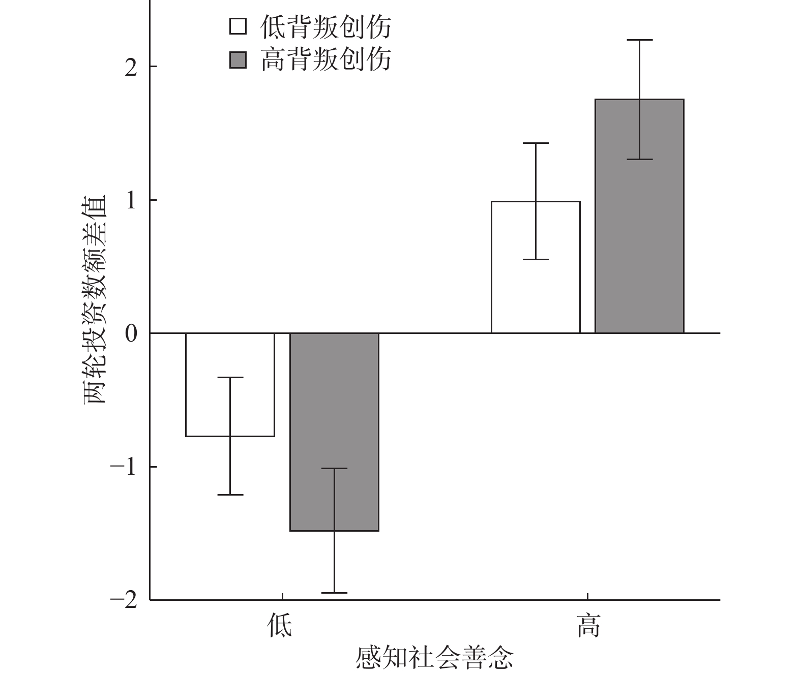 研究探讨背叛创伤个体的信任水平是否低于常人,并检验感知社会善念对信任提升及修复的调节作用。实验1使用信任游戏和SoMi范式,考察感知社会善念对信任行为水平的提升效果;实验2使用信任违背范式,考察感知社会善念对于信任修复效果的提升作用。结果发现:(1)高背叛创伤群体的信任水平低于低背叛创伤群体;(2)感知社会善念能有效提升信任行为并促进信任修复,且这一效果在高背叛创伤群体中更为明显。结果表明背叛创伤经历对个体的信任有着不良影响,并且感知社会善念可以在一定程度上修复这种影响。
