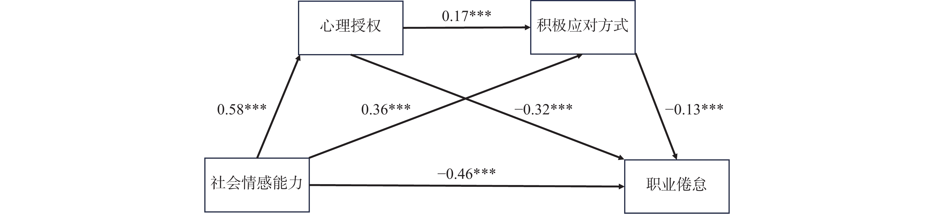 | 社会情感能力→心理授权→积极应对方式→职业倦怠 | [−0.021, −0.004] | −0.011 | 2.74 | |