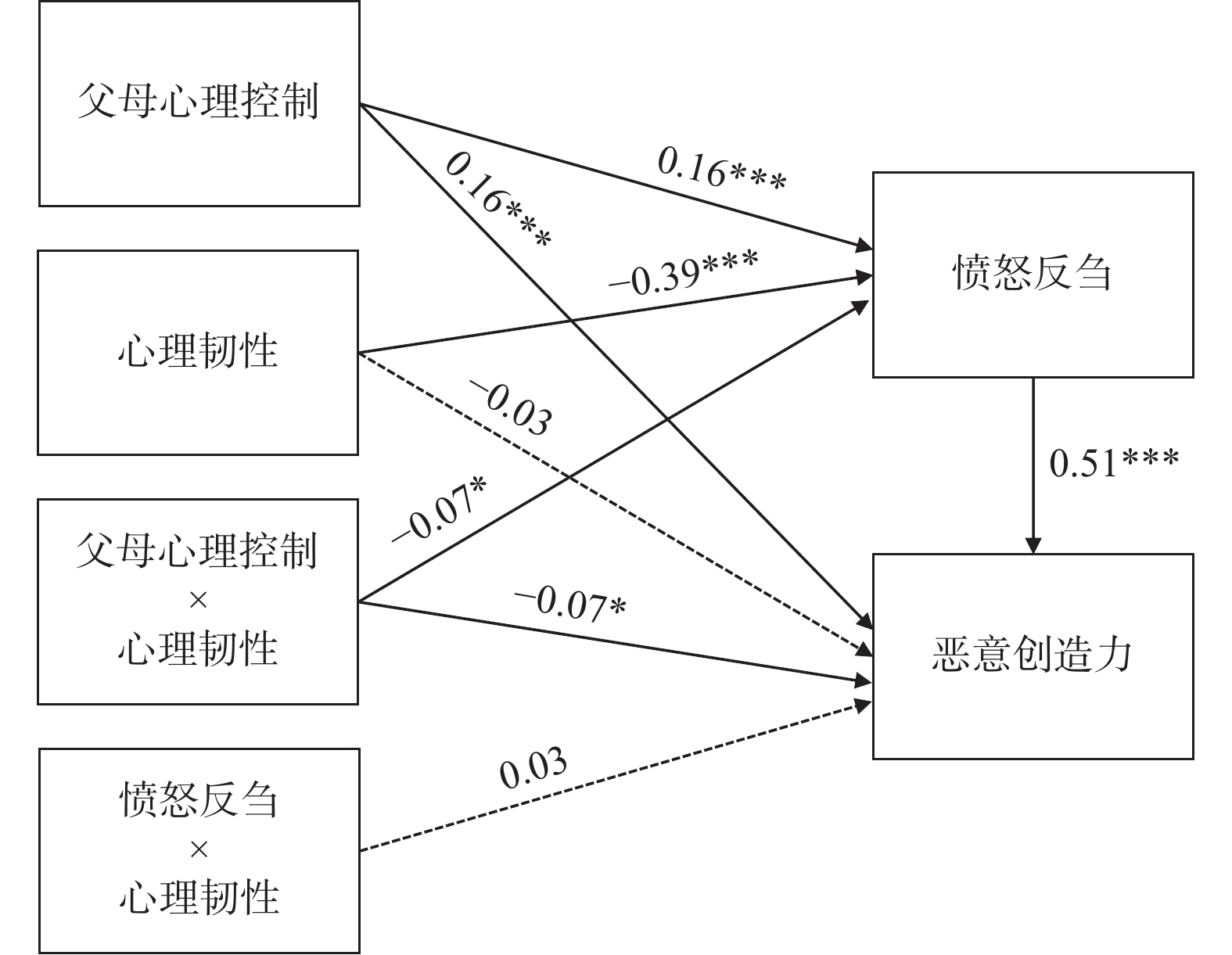 关键词: 父母心理控制, 恶意创造力, 愤怒反刍, 心理韧性, 中职生